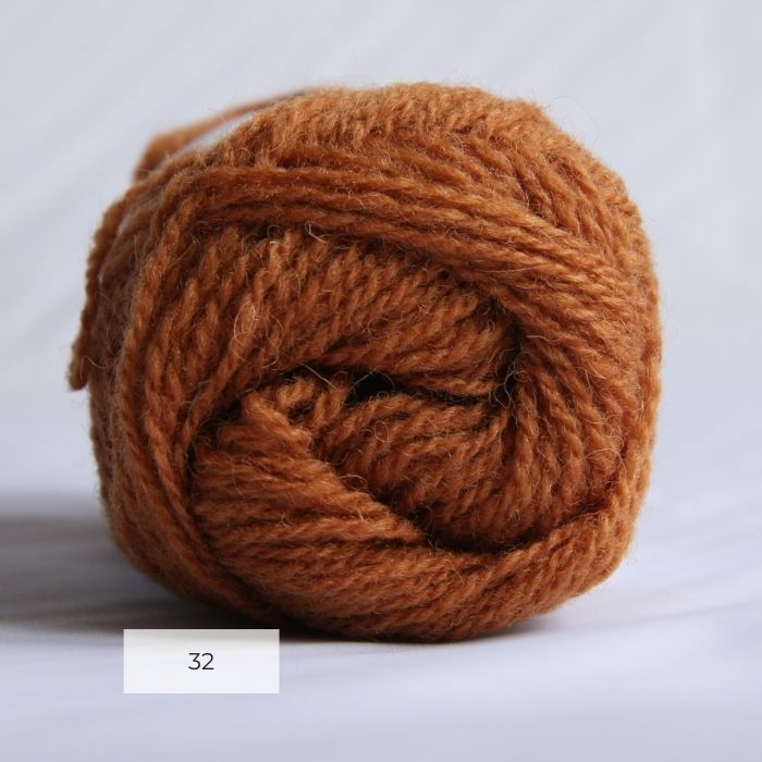 The end of a single ball of shetland wool in an amber colour