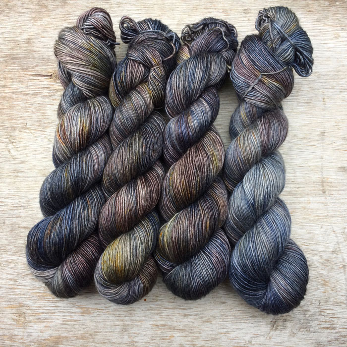 Four hanks of slightly silky yarn in shades of blue, brown, gold and plum