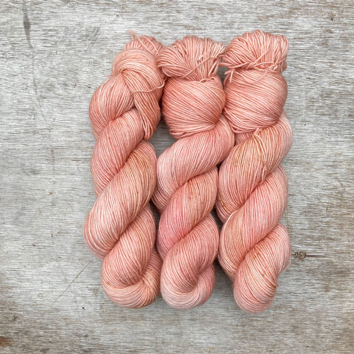 Three skeins of pink yarn with faint yellow speckles