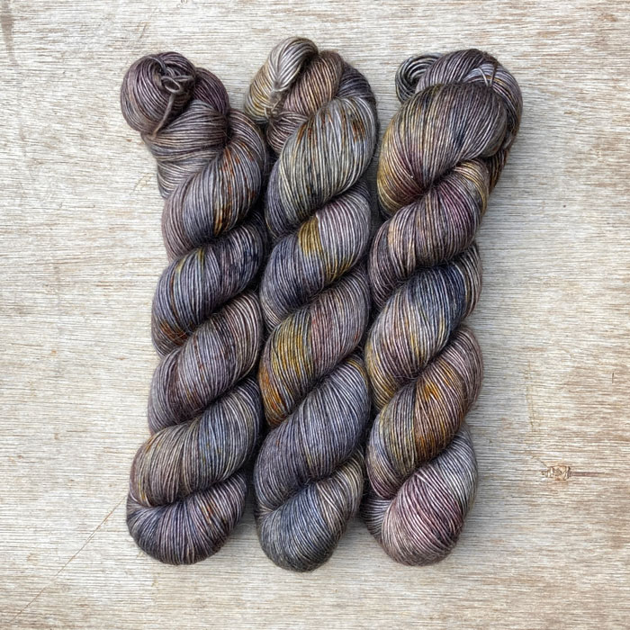 Three multicoloured skeins of wool in dark blues, plum and gold
