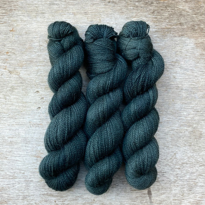 Three dark teal blue skeins of yarn