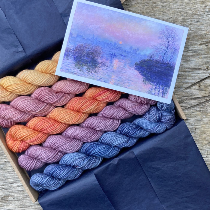 A tissue lined box with 5 sunset coloured mini skeins and the postcard inspiration