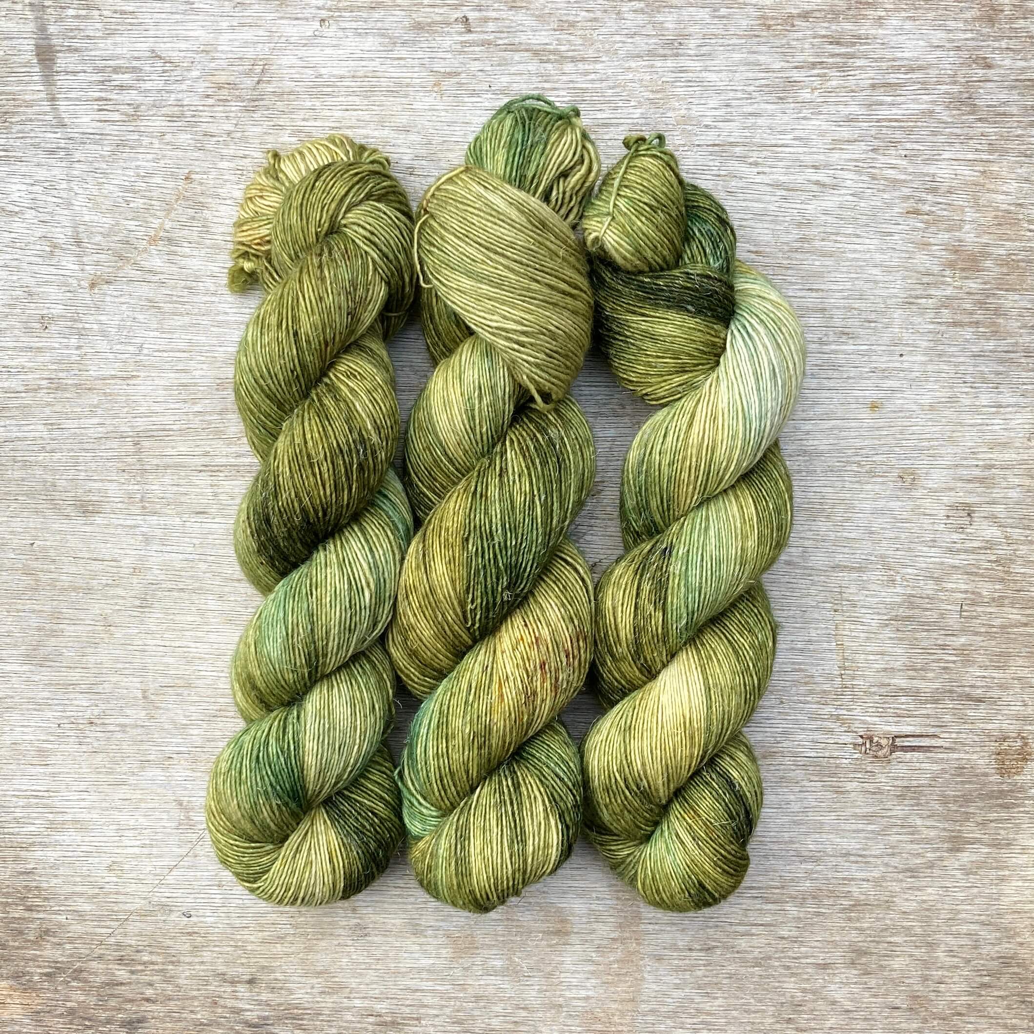 Three skeins of a wool and linen blended yarn in green with splashes of cream and flecks of gold