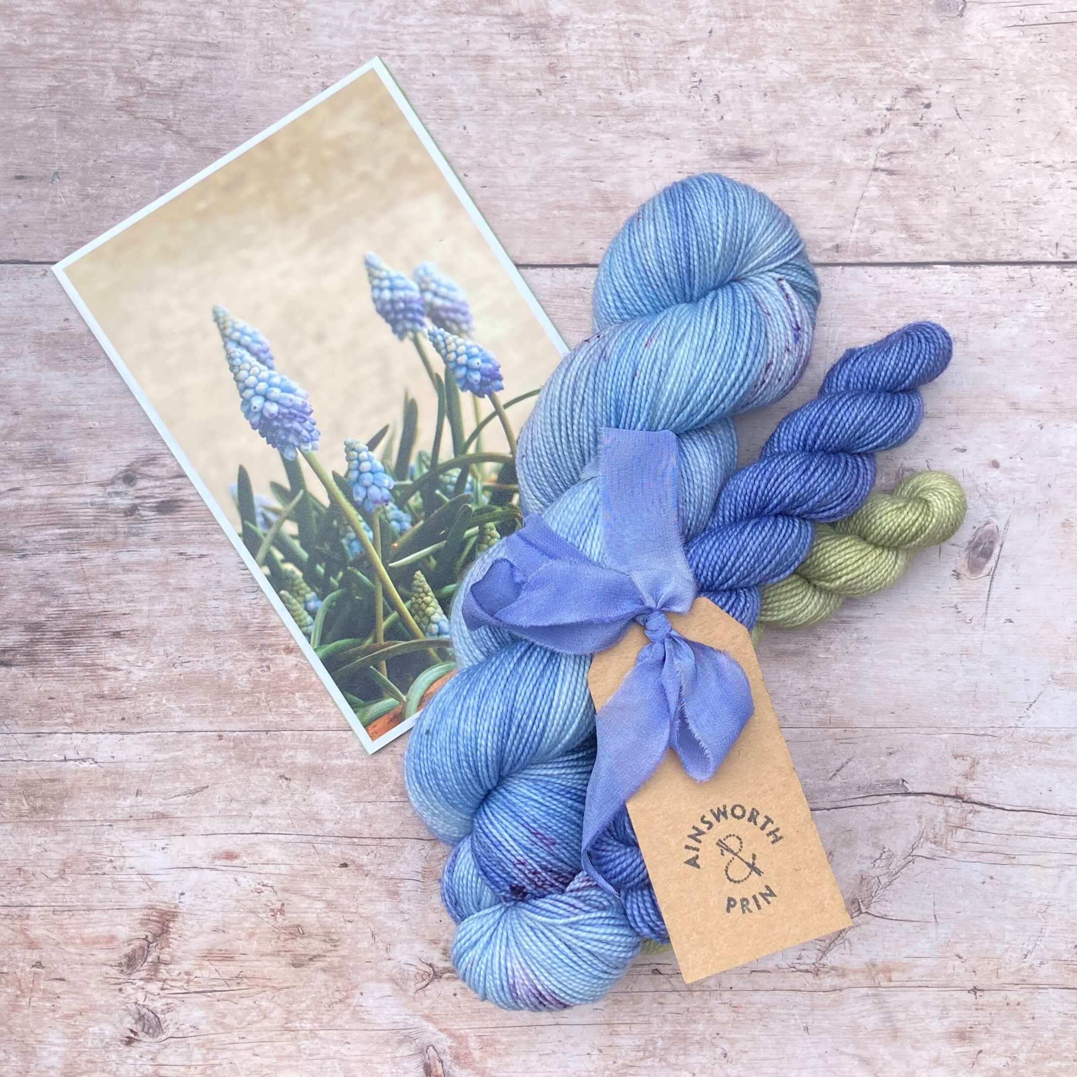 A full skein and two minis tied with a hand dyed ribbon and a photo of the flower that inspired their colours