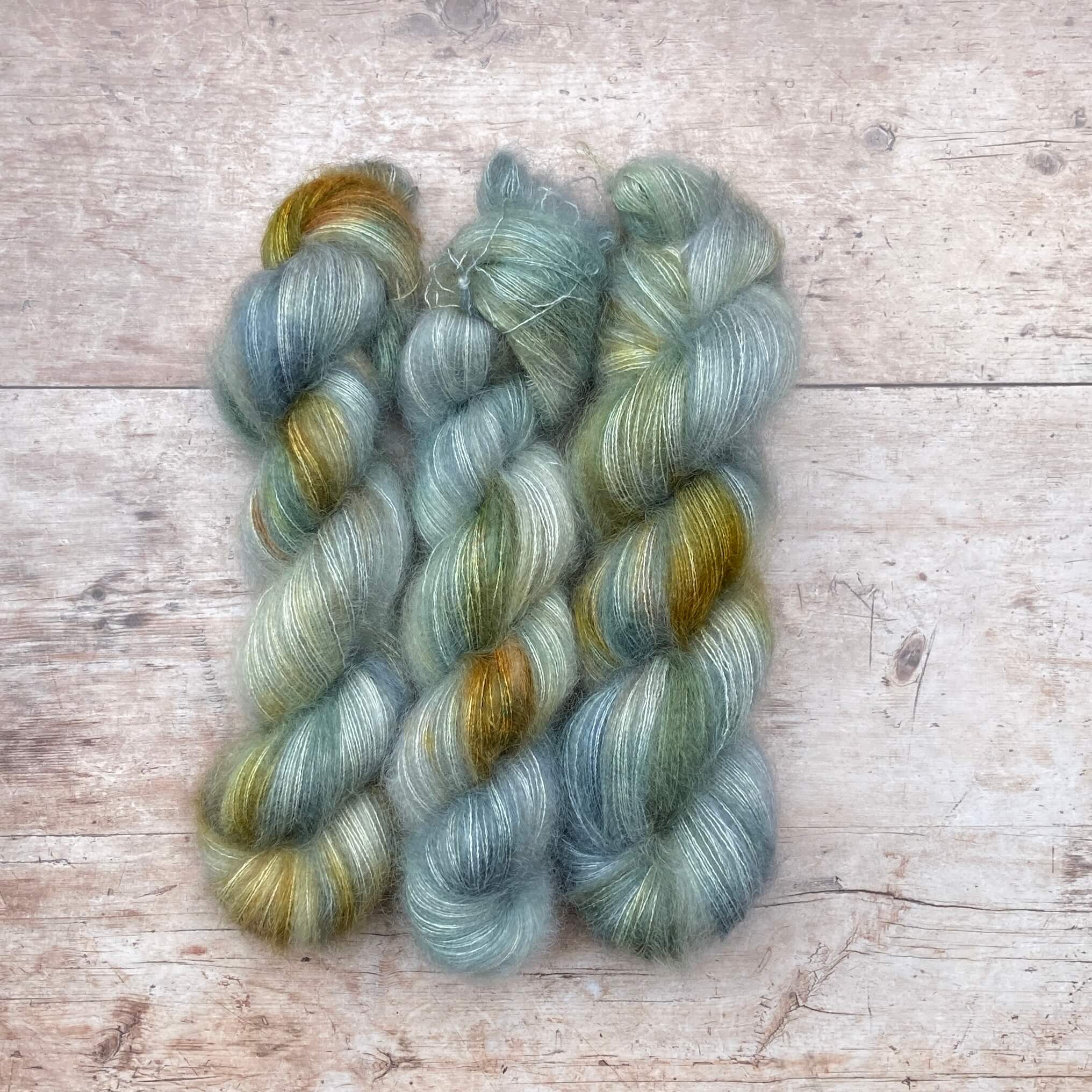 Three skeins of Mohair Lace in watery shades of blue and green with splashes of golden yellow