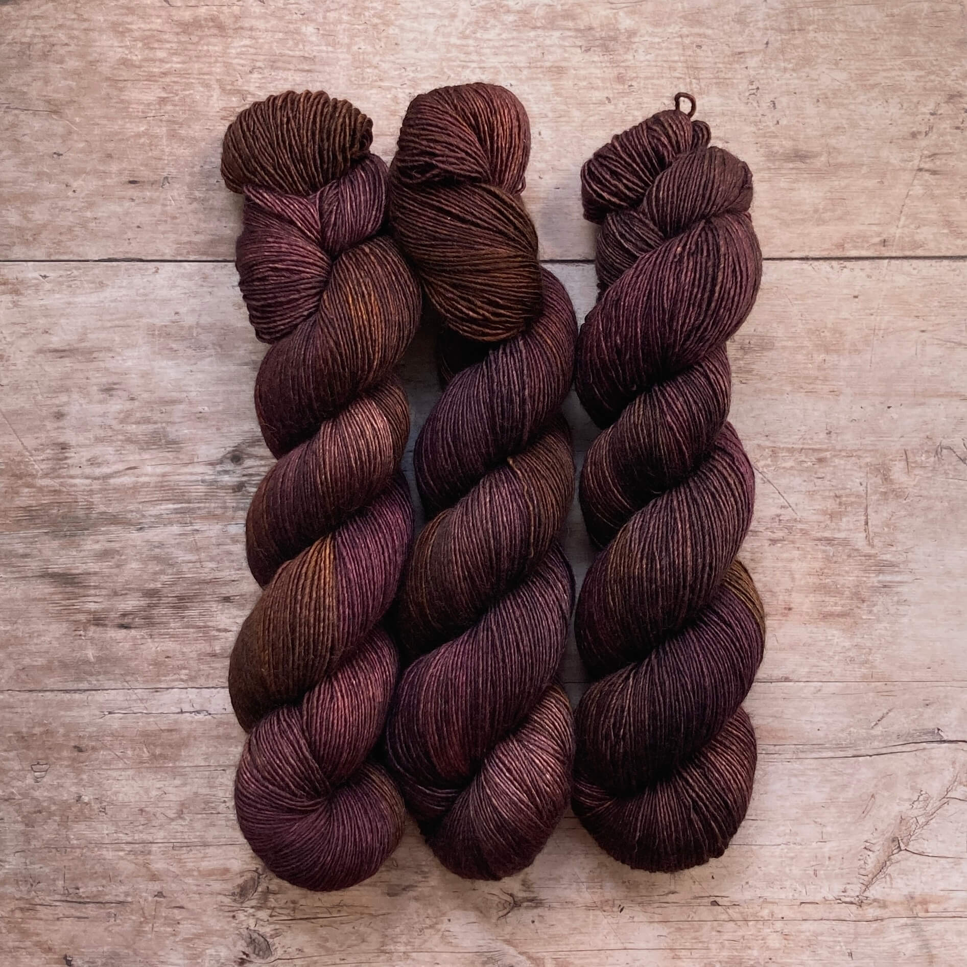 three skeins of Merino & Silk wool in brown, dusty pink and bronze