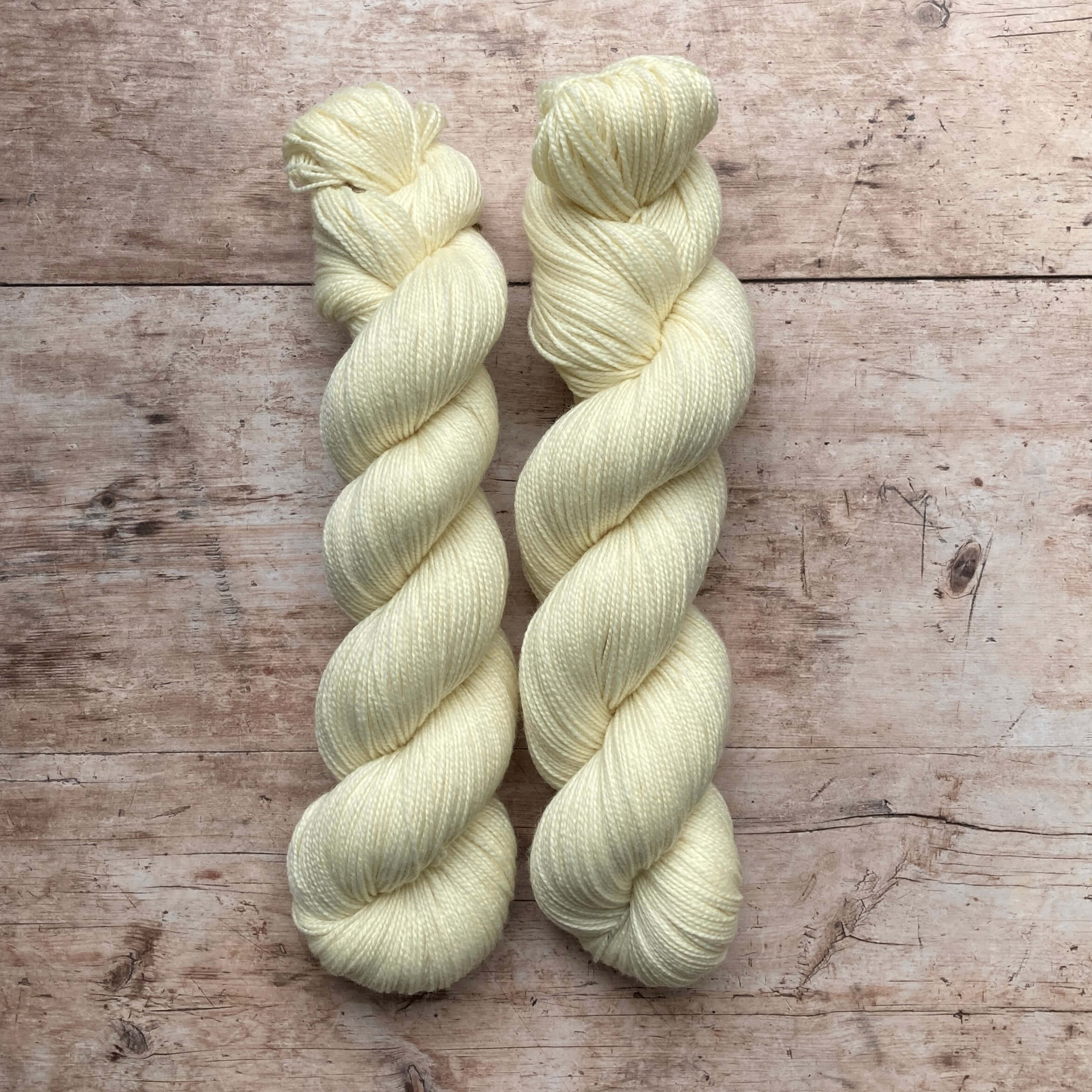 two skeins of undyed Classic Sock yarn on a wood background