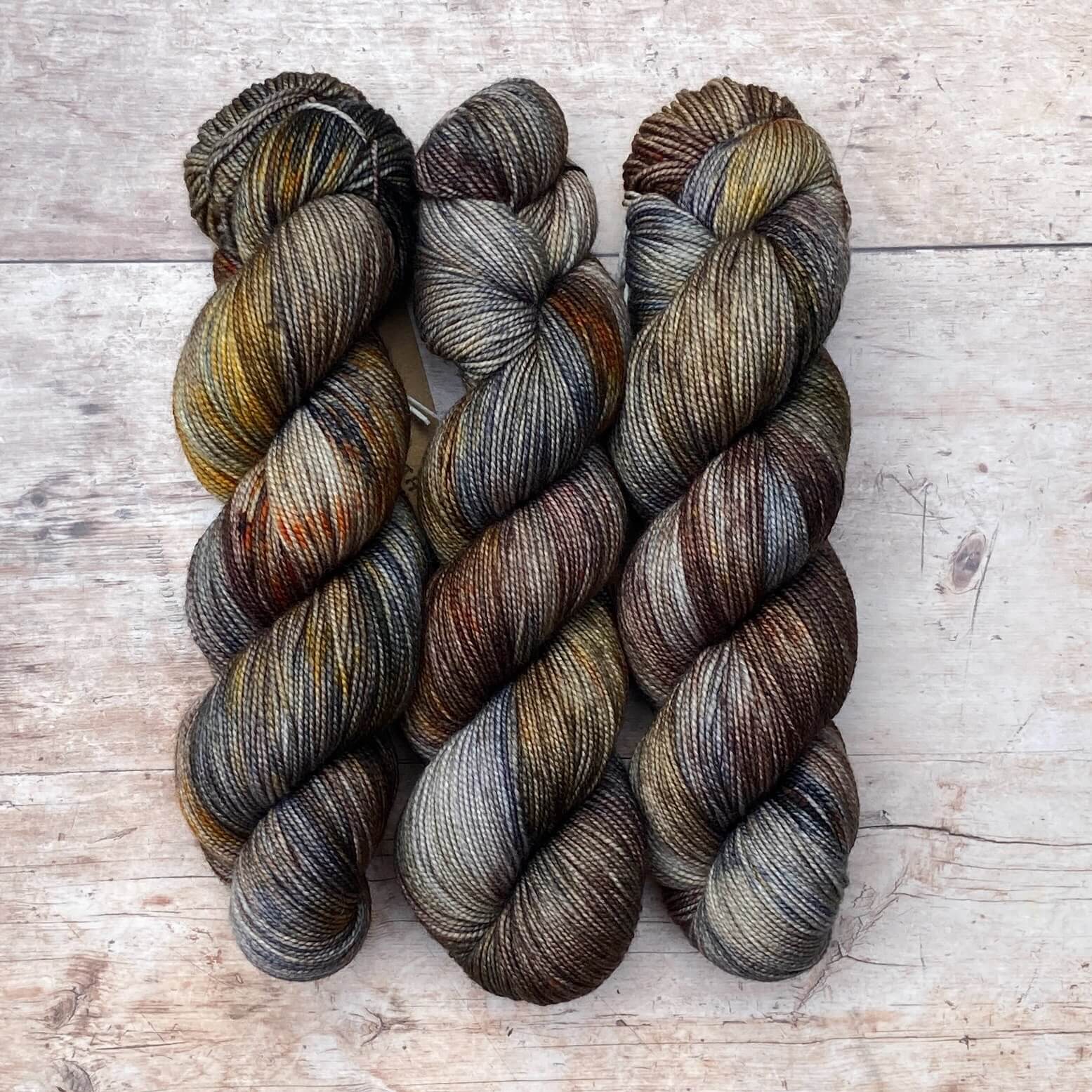 Three skeins of classic sock in dark blues, plum and gold