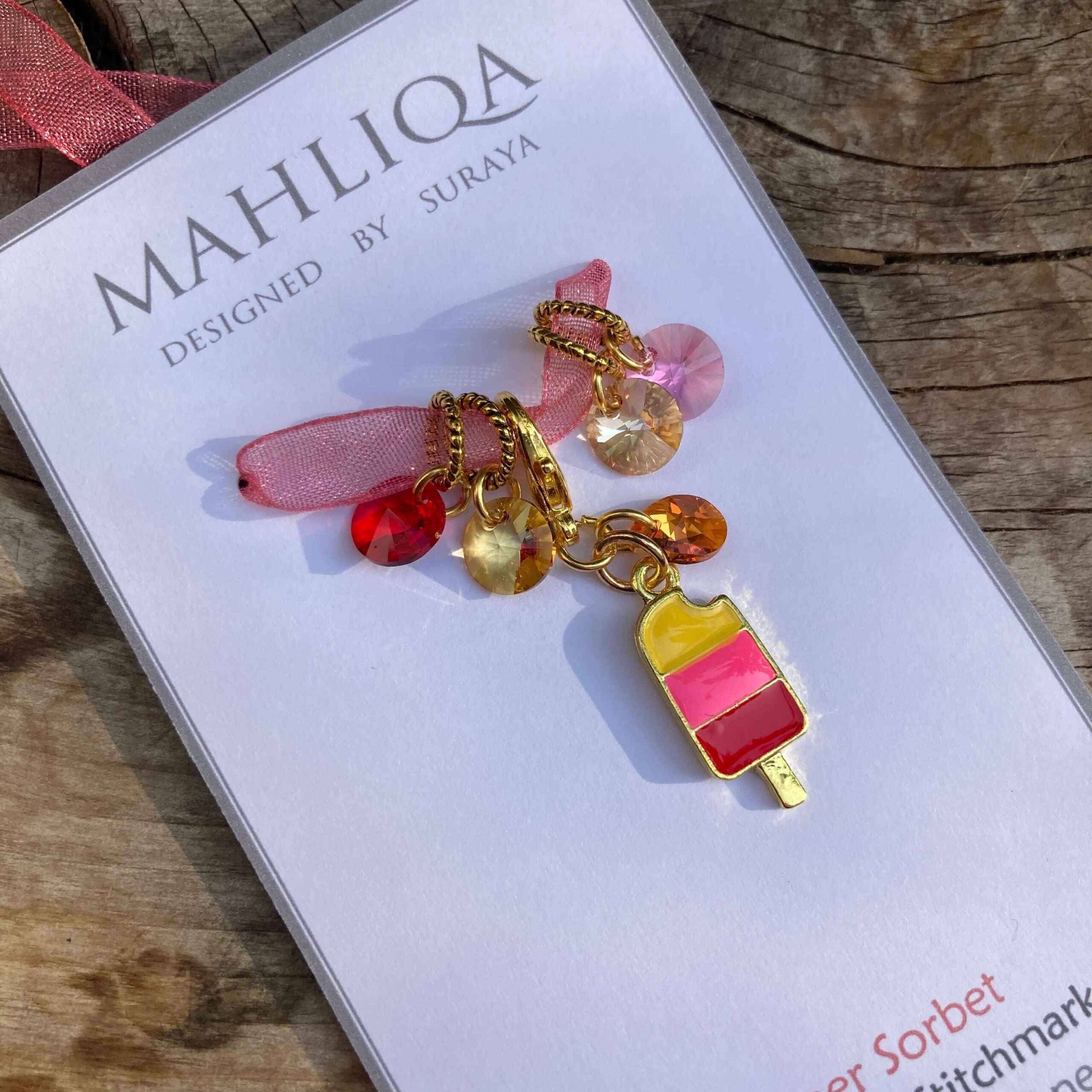 A removable marker in the shape of an ice lolly with four crystal markers in red, pink, bronze and gold