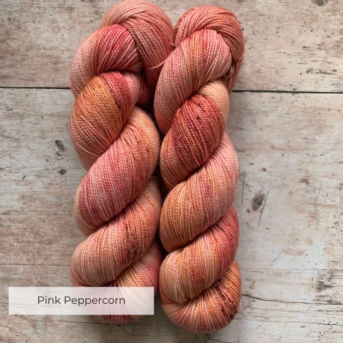 Two skeins classic sock in pinks and coral on pale wood surface