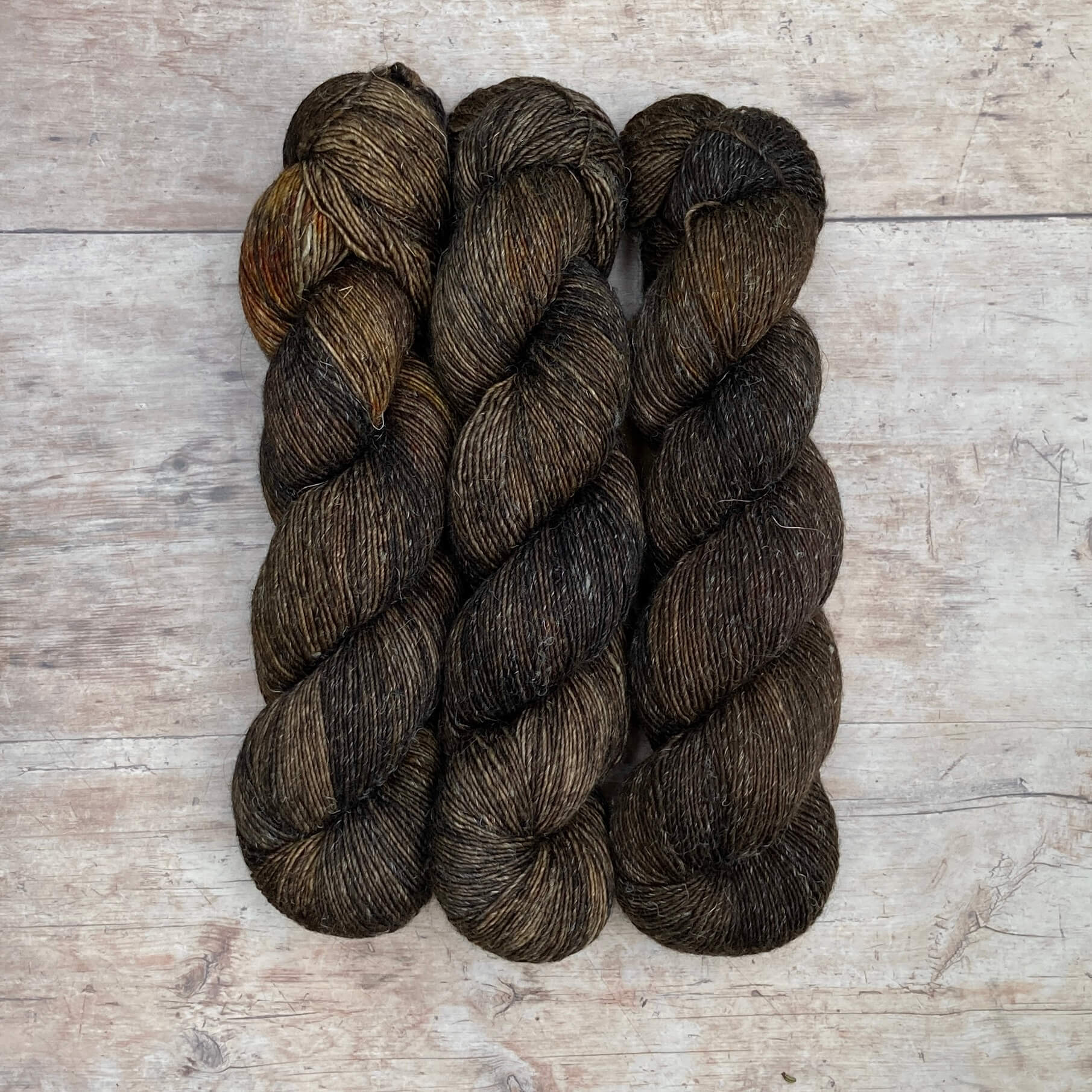 Three skeins of merino and linen in a in dark brown and grey