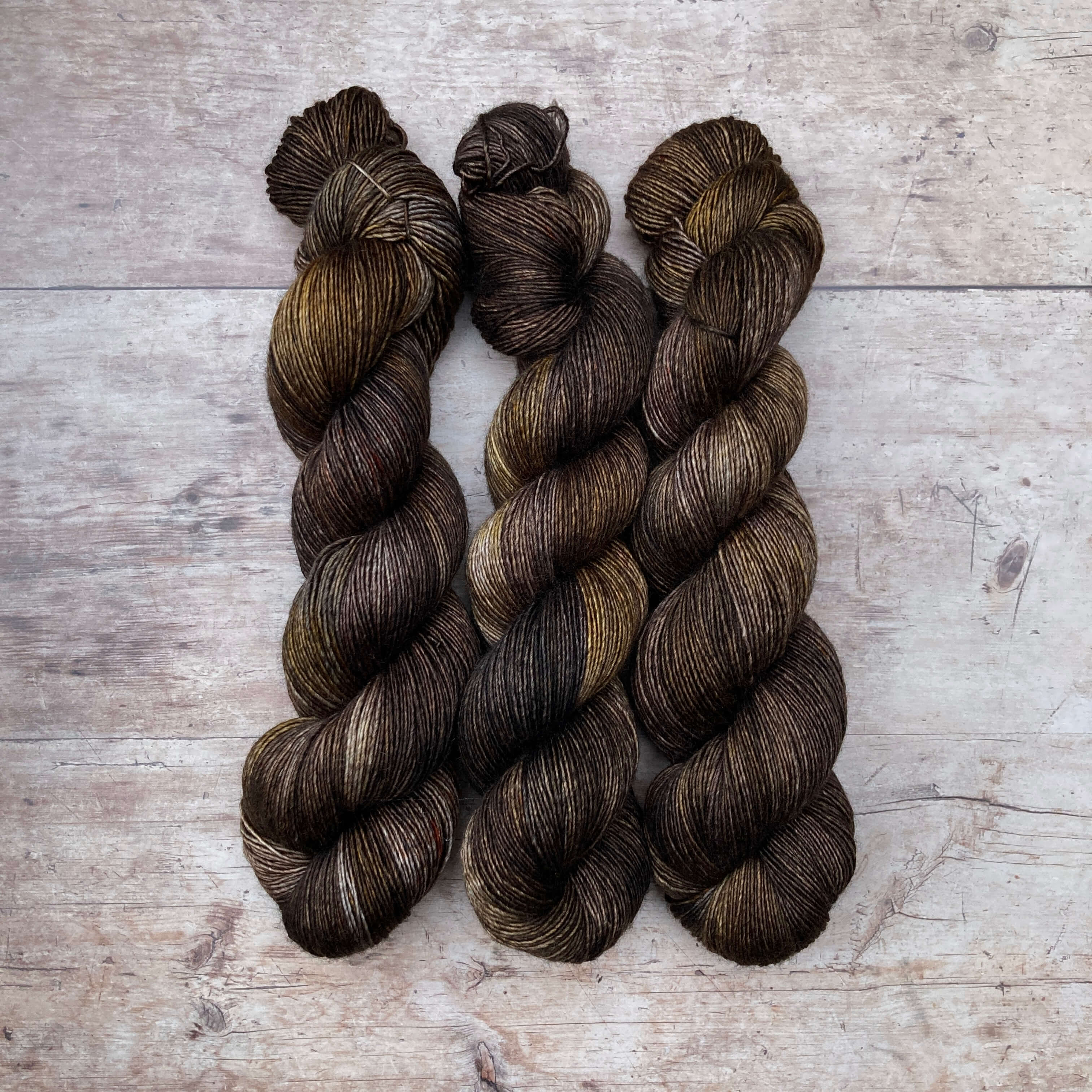 Three skeins of merino and silk in a in dark brown and grey