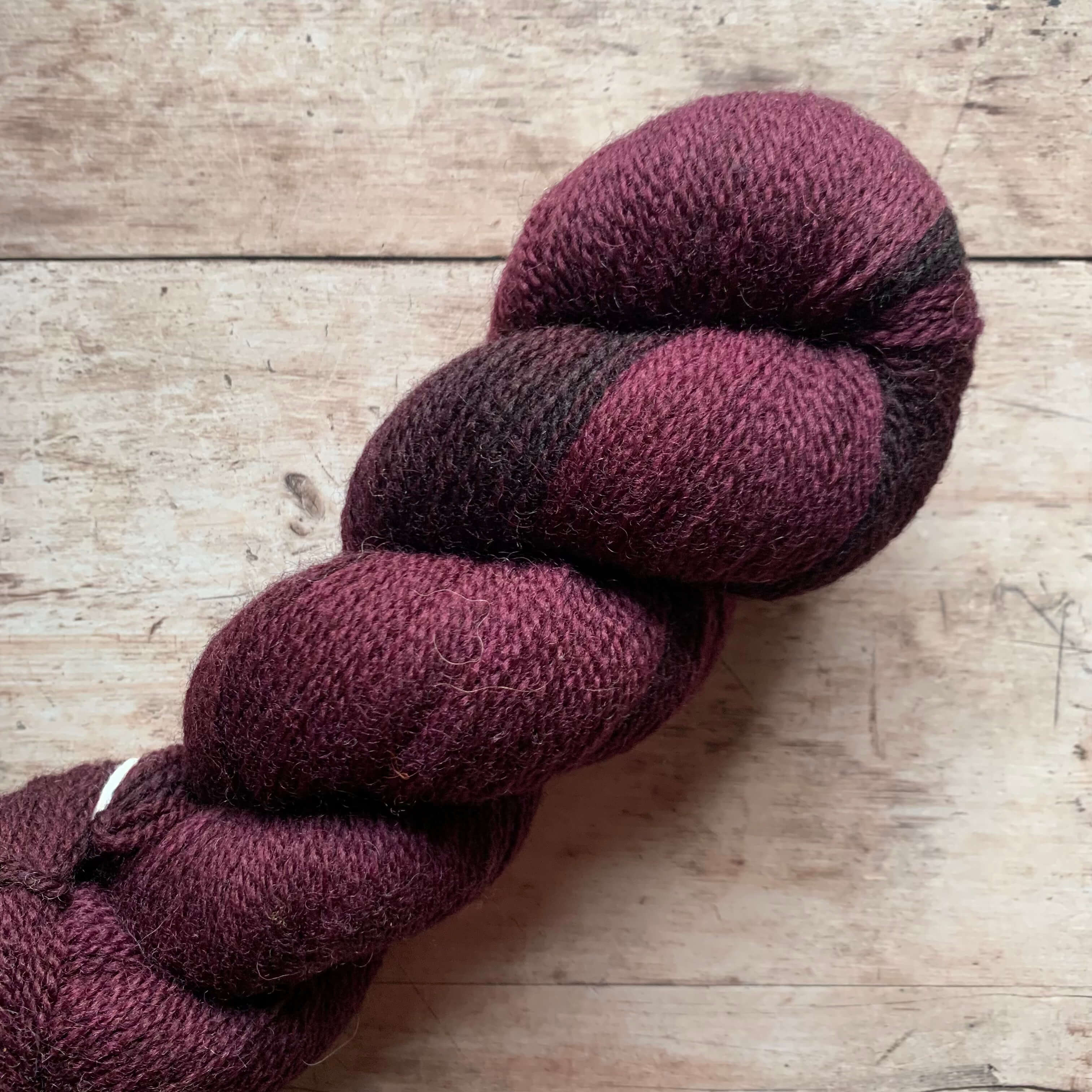 Three skeins of 4ply wool in deep plum purple