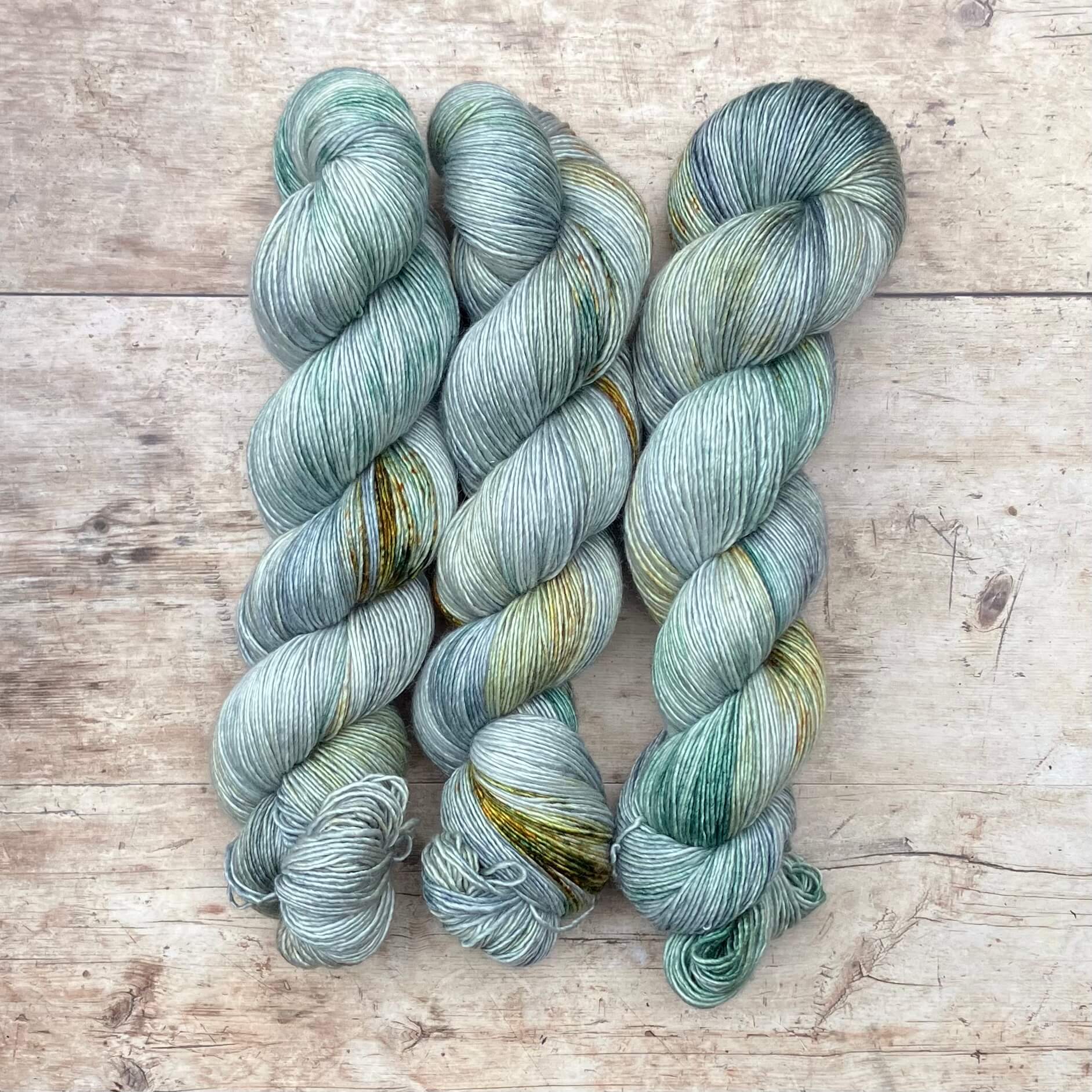 Three skeins of Merino & Silk in pale blue green with splashes of yellow