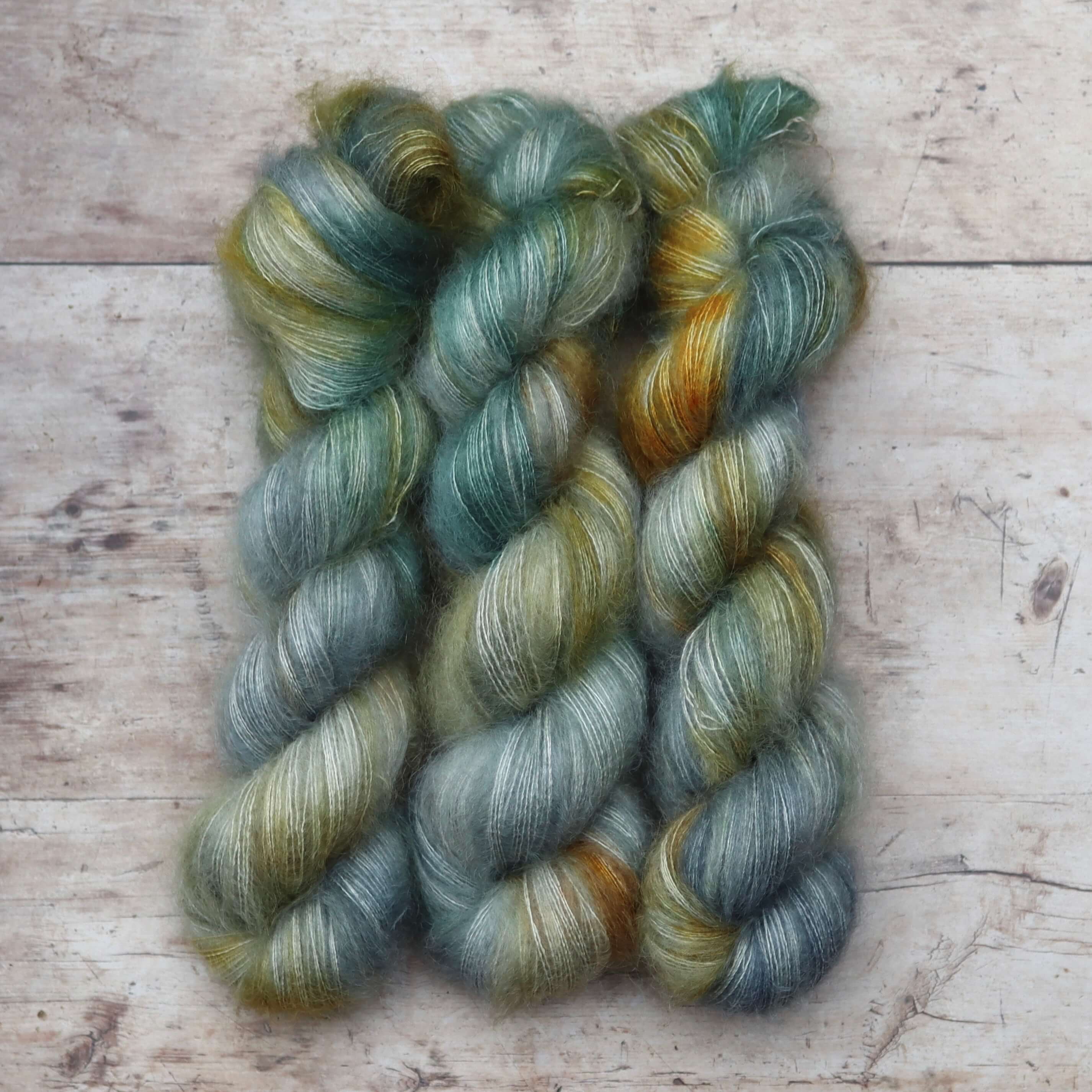 Three skeins of Mohair Lace in watery shades of blue and green with splashes of golden yellow