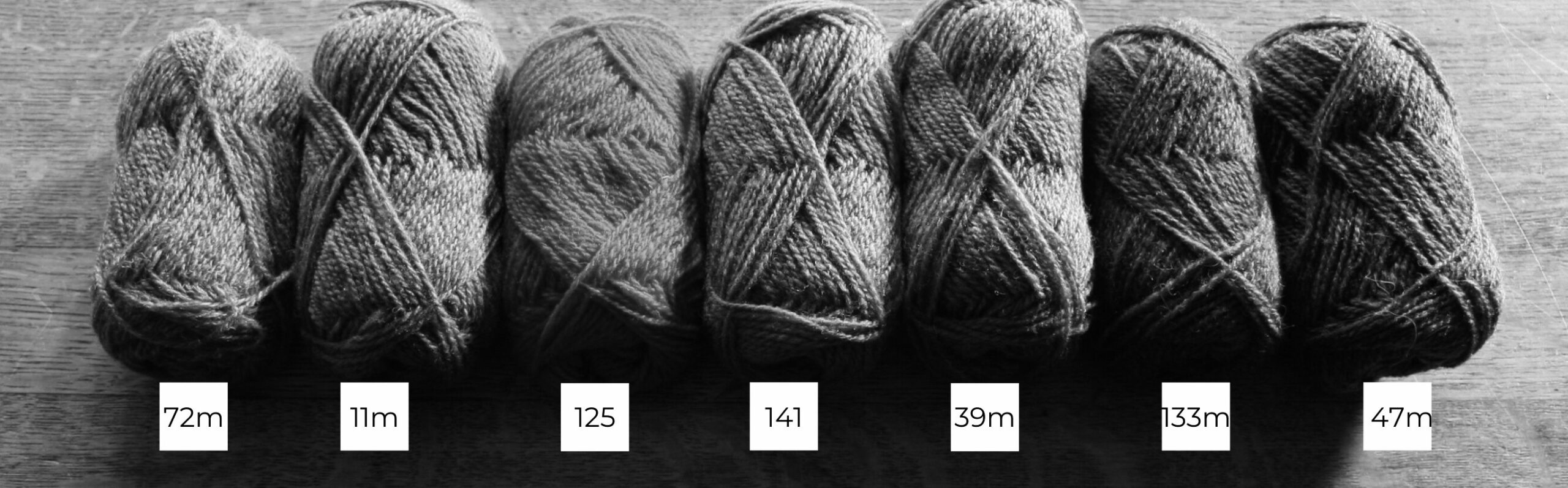 Seven balls of Shetland wool lined up in a row from light to dark in black and white