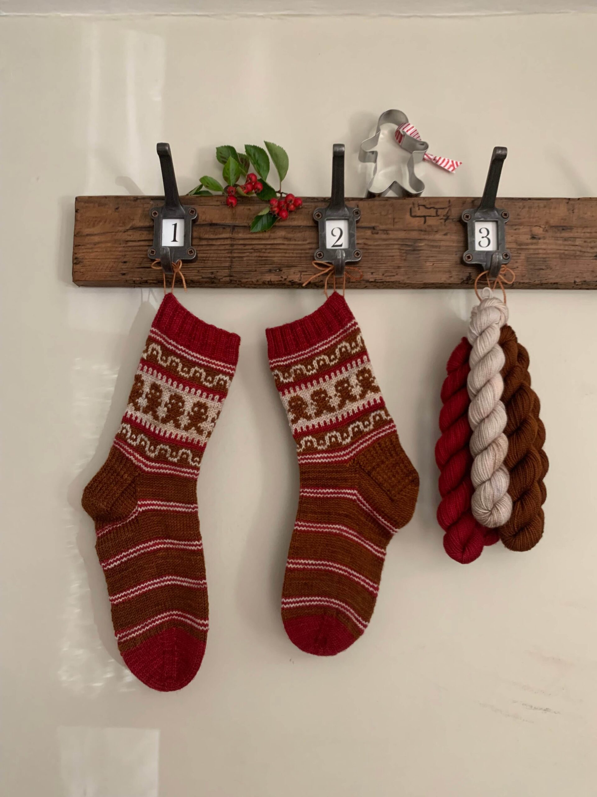 A pair of I'm a gingerbread man socks and yarn hanging from hooks