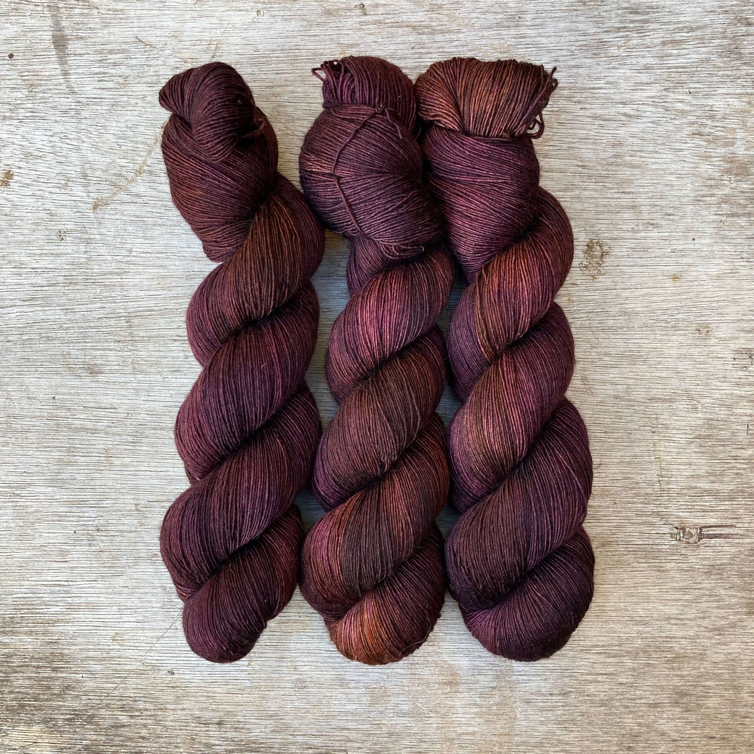 Three skeins of merino and silk lace in brown, dusty pink and bronze