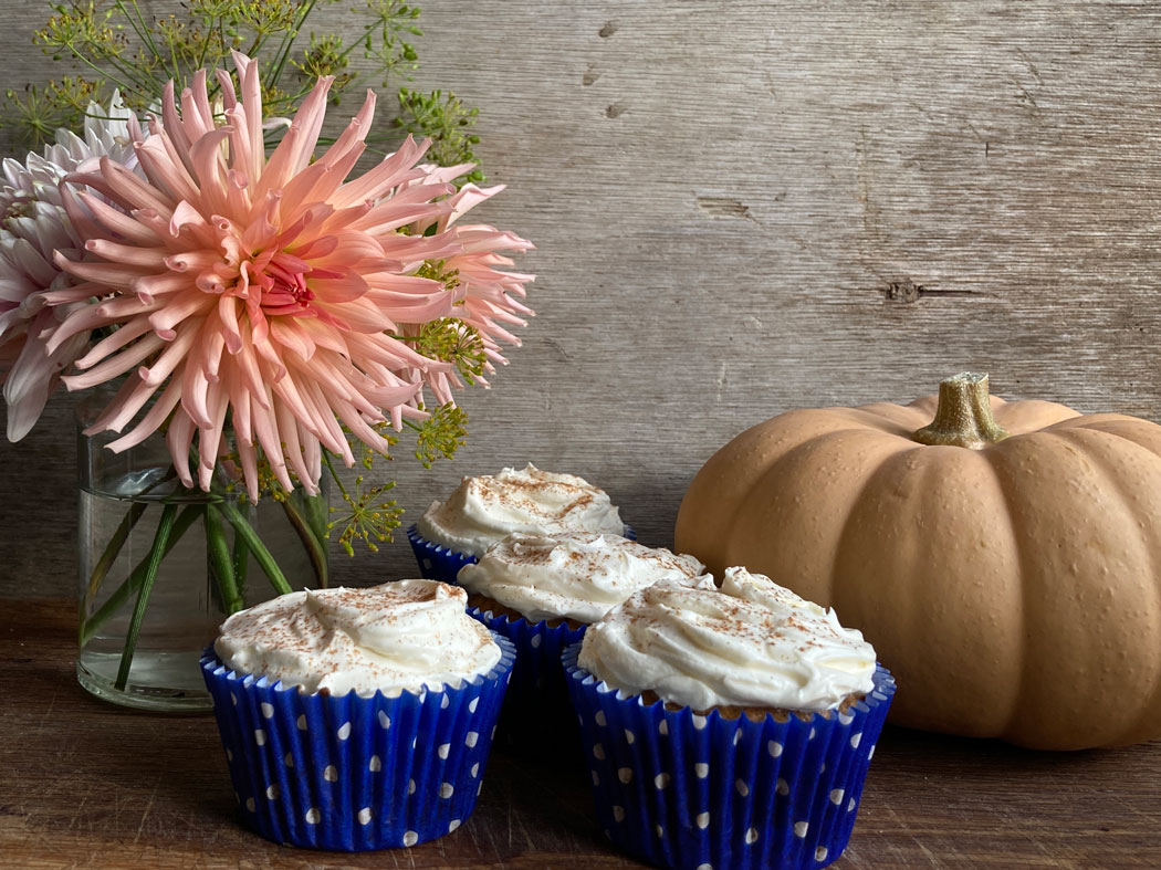 Four iced cakes next to a pumpkin and a vase of dahlias
