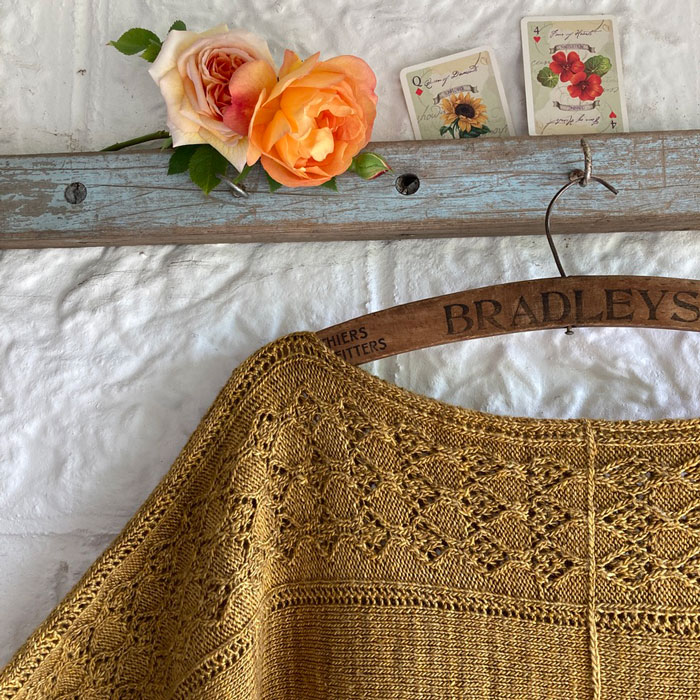 This is a simple, floaty T-shaped top to be worn over a strappy vest top or summer dress. The lacy border that twists across the shoulders of the top will let a little breeze in, but still give warmth if it turns chilly. It would make an excellent alternative to a summer shawl.