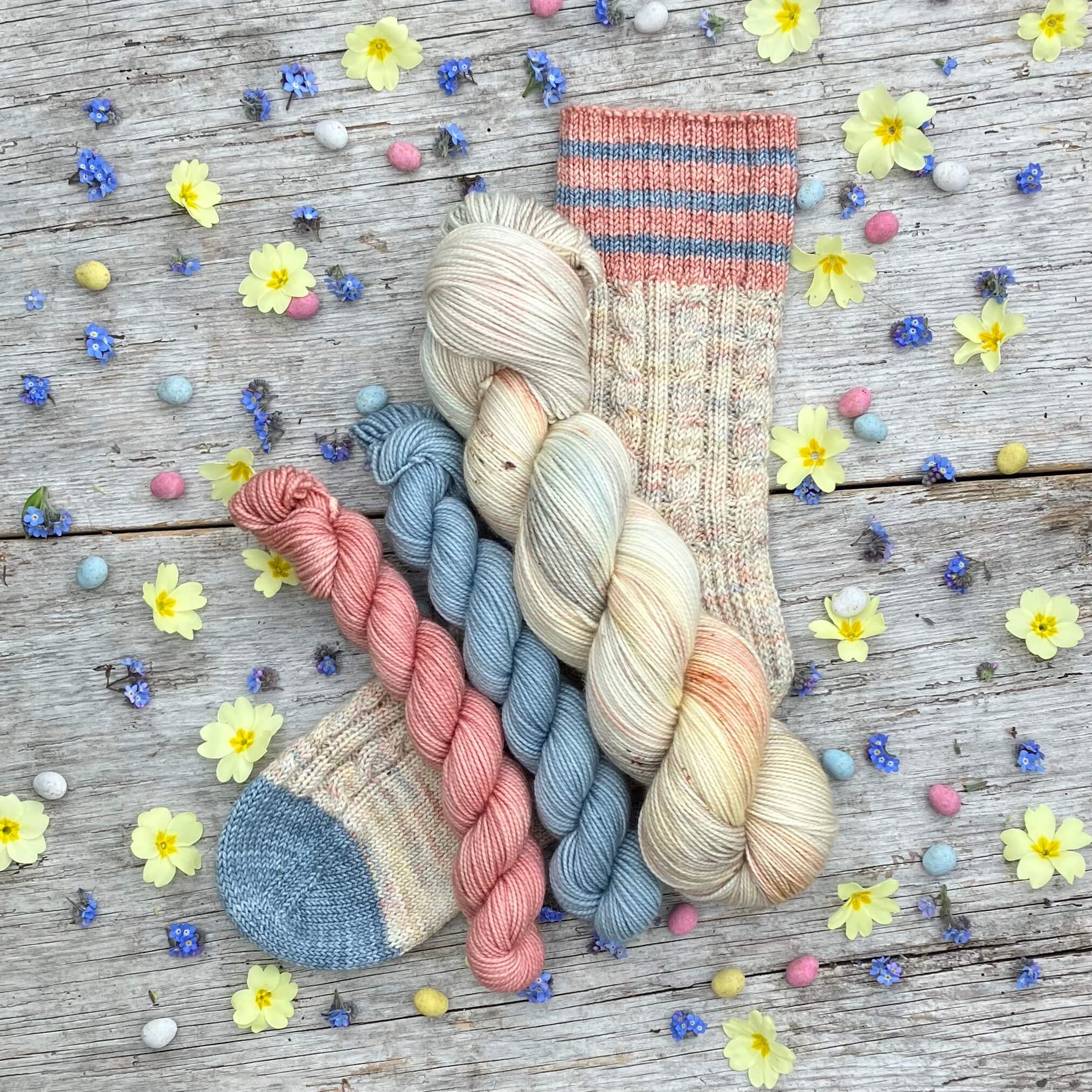 Hand-dyed sock sets: a full skein of sock yarn with two complementary mini skeins for stripes, heels, toes or what ever else takes your fancy.