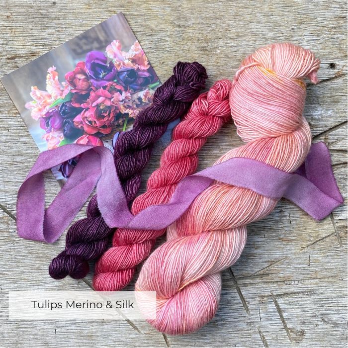 Hand-dyed sets: a full, 100g skein of yarn in the base of your choice with two complementary mini skeins the colours inspired by the flower of the month tied with a hand dyed silk ribbon.