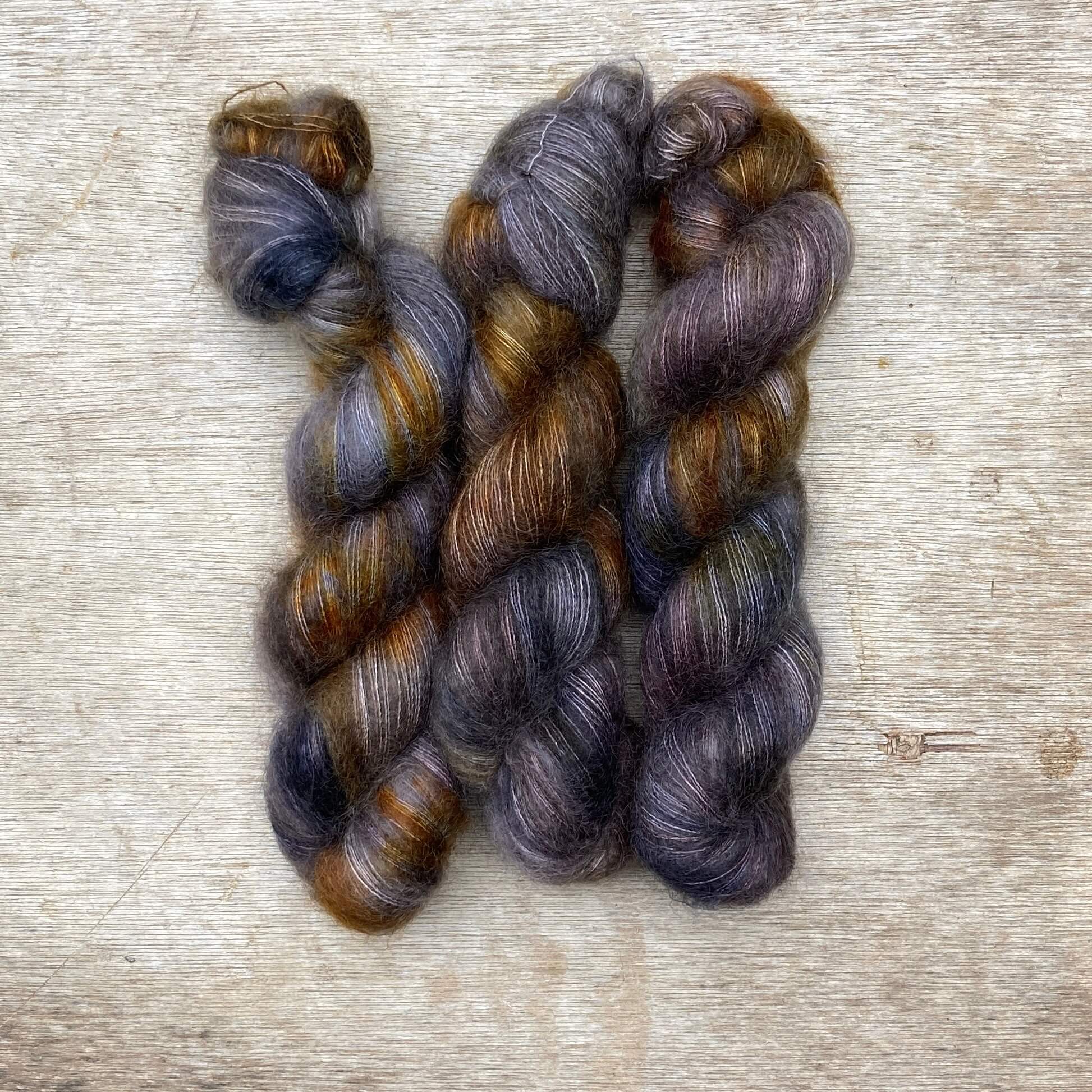 Luxuriously fluffy, hand dyed kid mohair blended with silk. This base has a higher percentage of silk than our other mohair silk lace base. Use it on it’s own or double it up with another yarn to add halo and softness without weight.