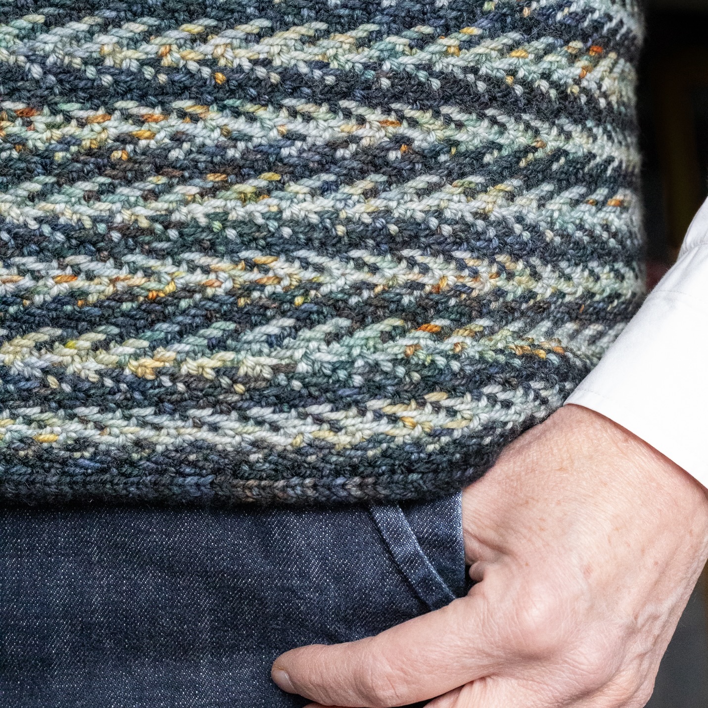 Freight is knit from the top down, starting at the back neck using Julie Weisenberger’s Cocoknits Method: increases are made for the shoulders, then these stitches are worked until the underarm shaping is complete. Stitches for the front are picked up from the back shoulders, and after completing the neck and underarm shaping, the back and front are joined and worked in the round. The herringbone stitch border is a simple staggered slip stitch and quite addictive. All the edges are neatly finished with Icord.