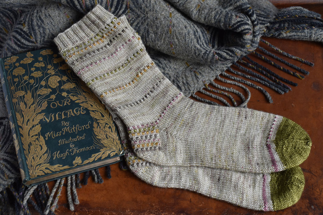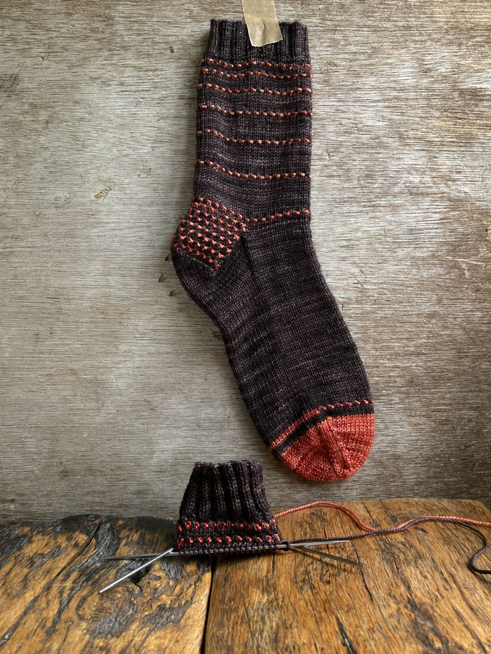 A top down sock with an easy slip stitch pattern separated by increasing rounds of stocking stitch. The pattern is carried on down the heel flap and repeated once more on the toe. After shaping the toe, stitches are grafted together.