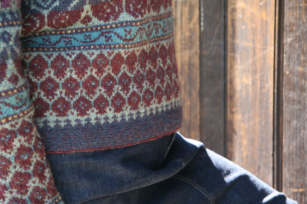 Seraph is influenced by the rich colours used in the decoration of the Arts and Crafts Watt’s Chapel in Surrey. It uses eight shades of Jamieson & Smith’s 2ply Jumper Weight Shetland Wool and has contrast colour cast-ons and garter stitch edgings. Charted colour work.