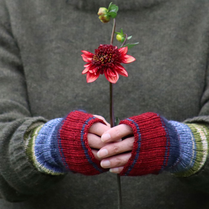 A woman's hands wearing stripy wrist warmers holding a flower
